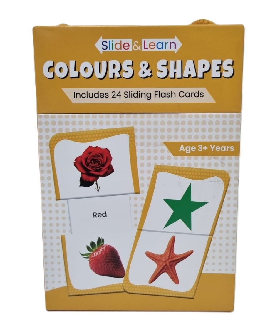 The Slide & Learn: Colours & Shapes flash card set is the perfect companion for a child’s early developmental journey. Unlike traditional flat cards, these interactive panels feature a unique sliding mechanism. A child can look at an image—such as a bright red rose—and then slide the panel to reveal the corresponding word “Red” and a matching object like a strawberry. This physical interaction reinforces the connection between visual objects, their colors, and the written word.